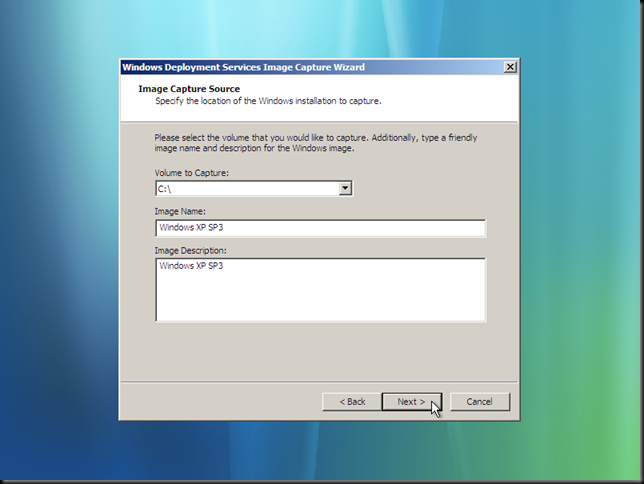 82. Select C:\ as the volume to capture and enter Windows XP SP3 for Image Name: and Image Description: